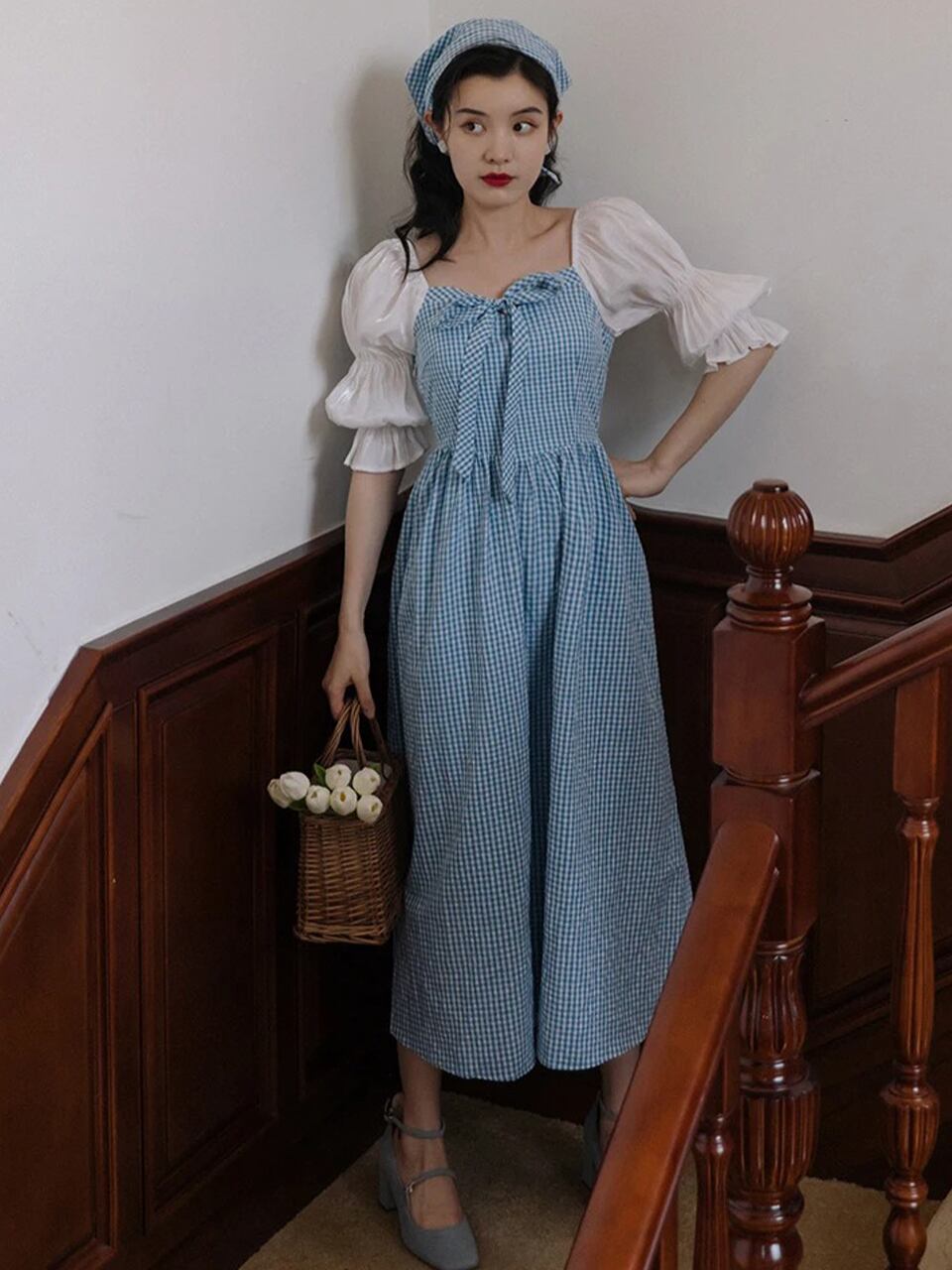 【0011】Blue Check Ribbon Short Sleeve Dress
