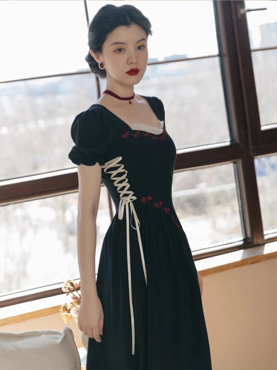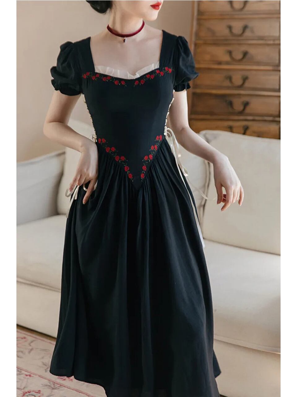 【0031】Side Lace-Up Black Elegant Short Sleeve Dress