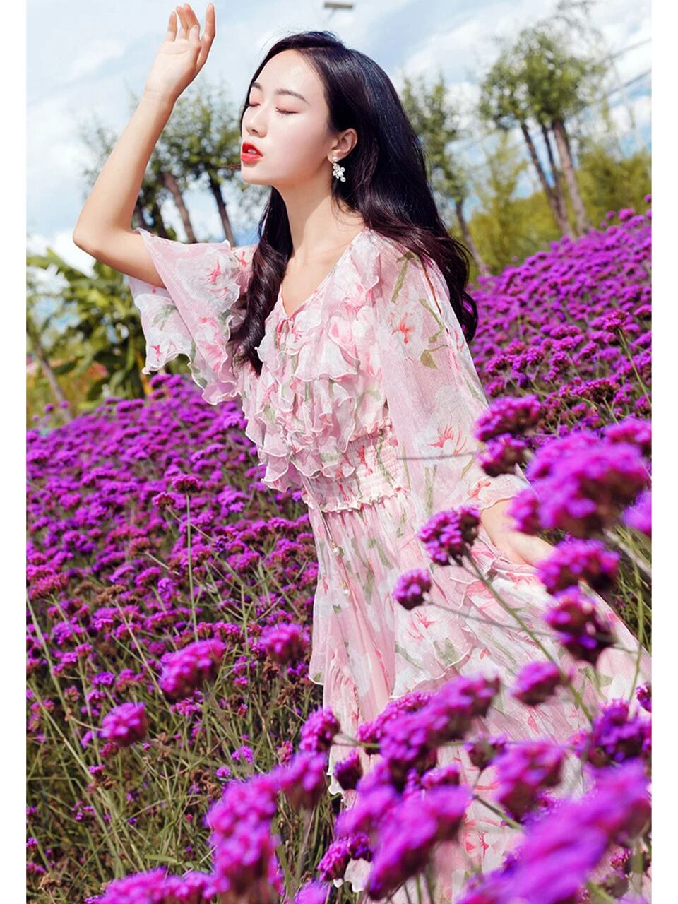 【0062】Pink Flower Chiffon Frill Short Sleeve Dress