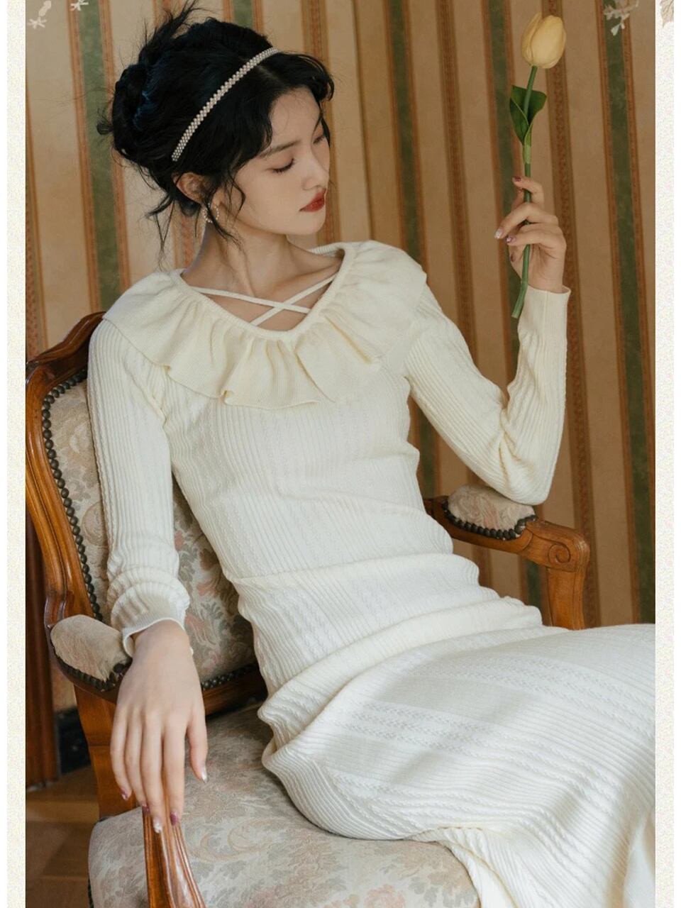【0109】Ruffle Collar Rib Knit Long Sleeve Dress