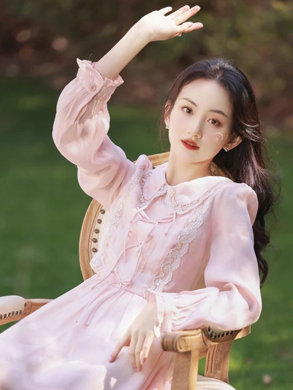 【0113】Round Collar Lace Pink Long Sleeve Dress
