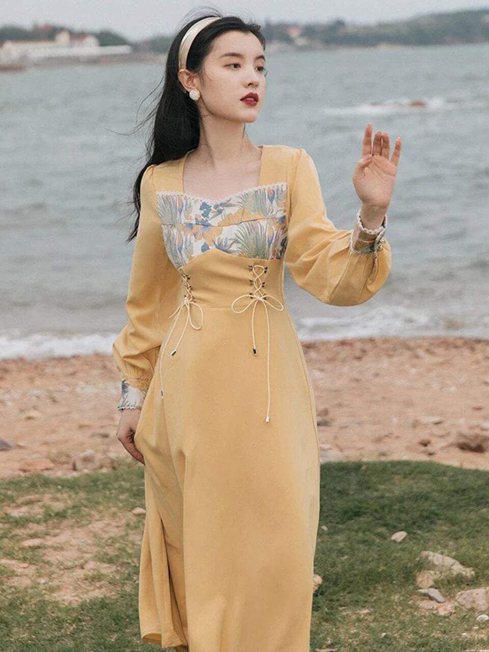 【0137】Waist Ribbon Elegant Long Sleeve Dress