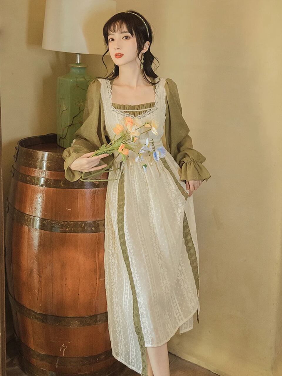 【0139】Waist Ribbon Cottage Style Long Sleeve Dress