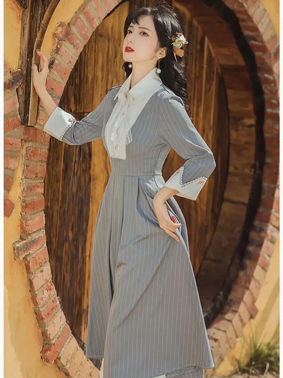 【0152】Gray Striped Pleats Long Sleeve Dress