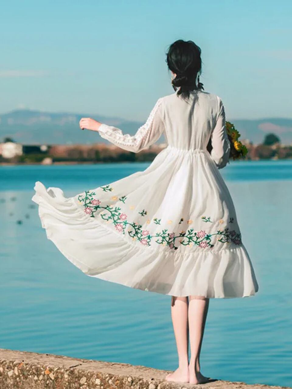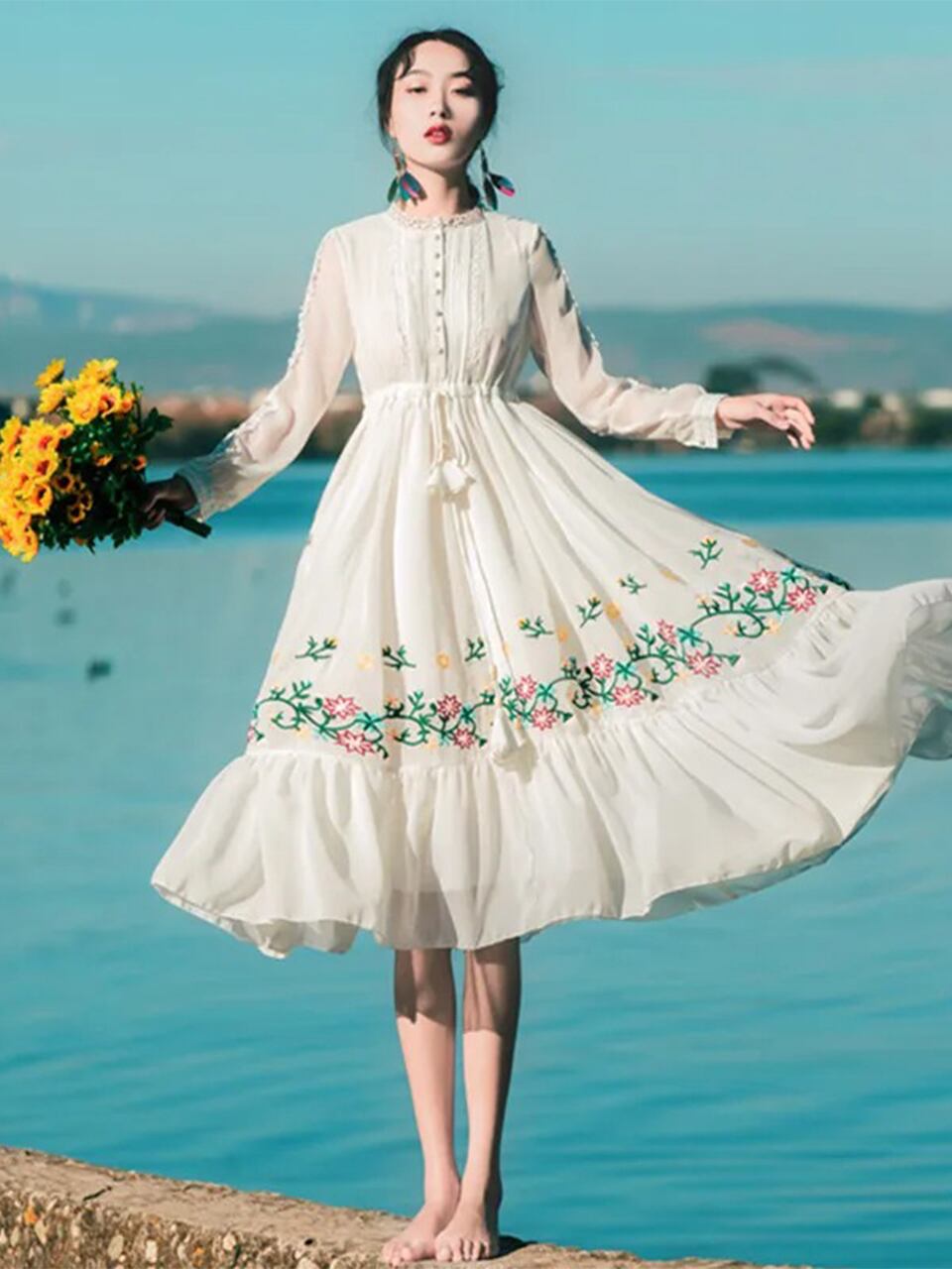 【0161】Flower Embroidery A-line Long Sleeve Dress