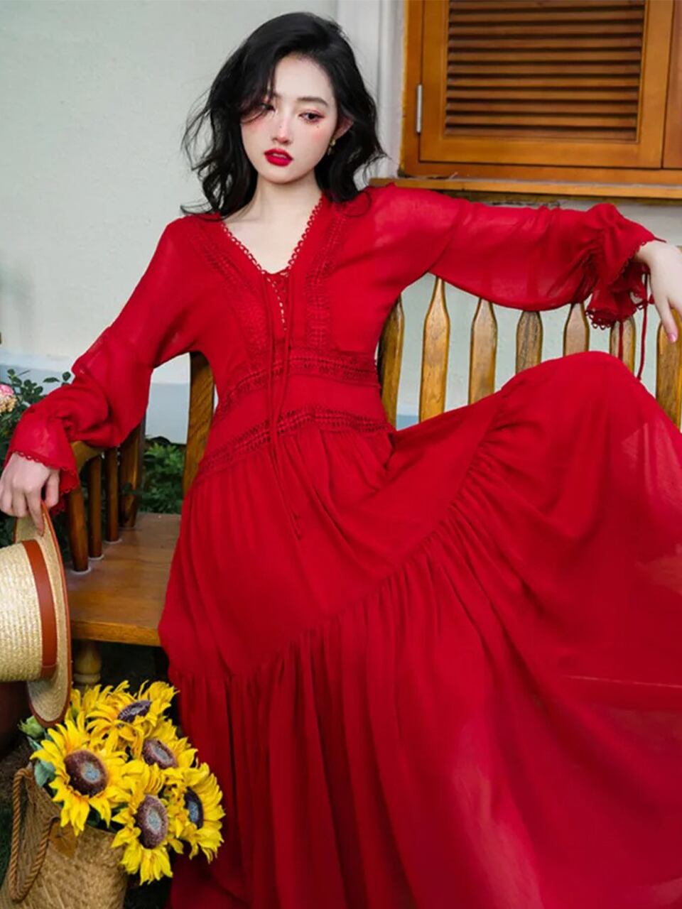 【0162】V-neck Tiered Red Long Sleeve Dress
