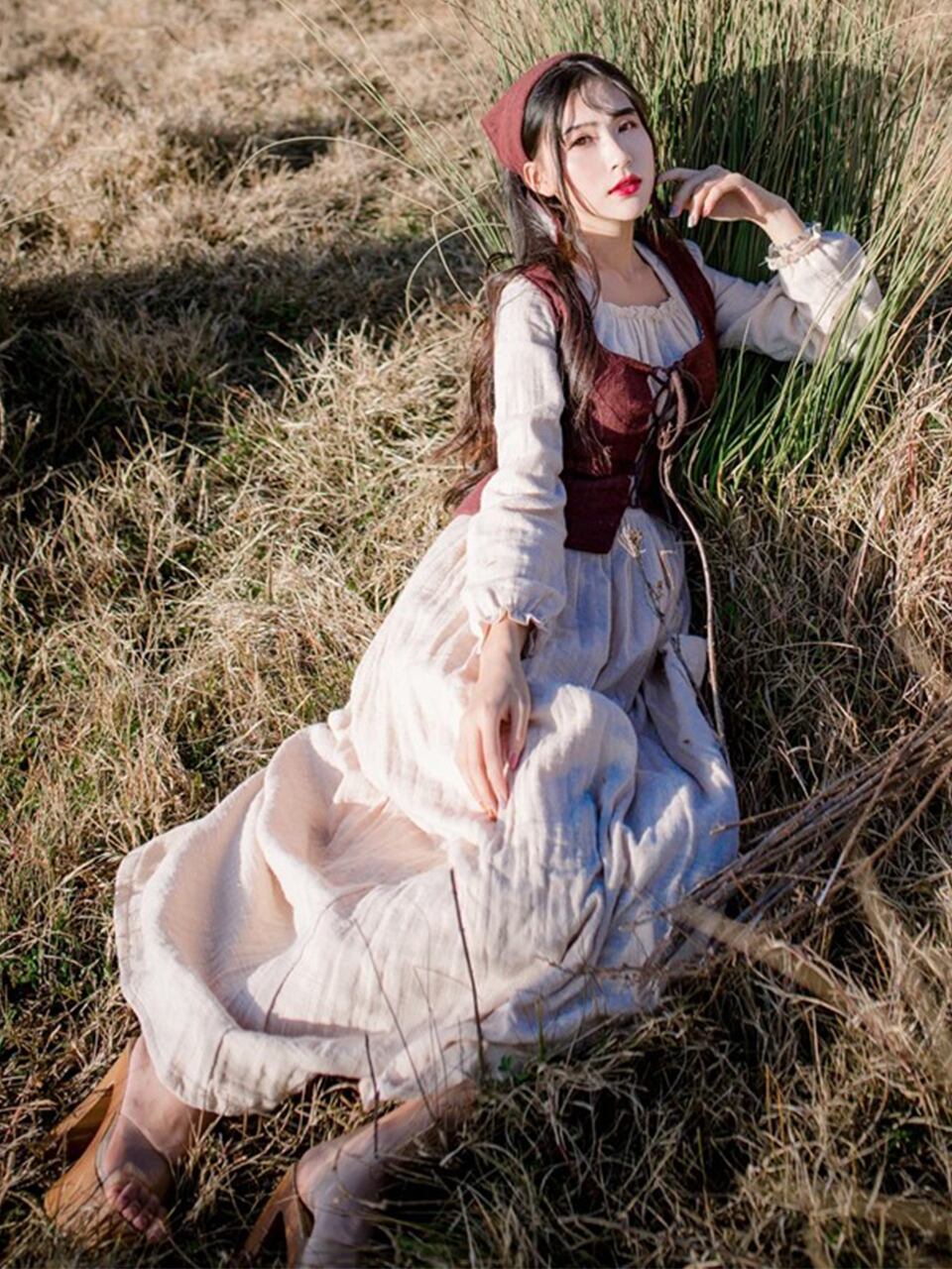 【0187】2sets Lace-up Ribbon Vest Long Sleeve Dress