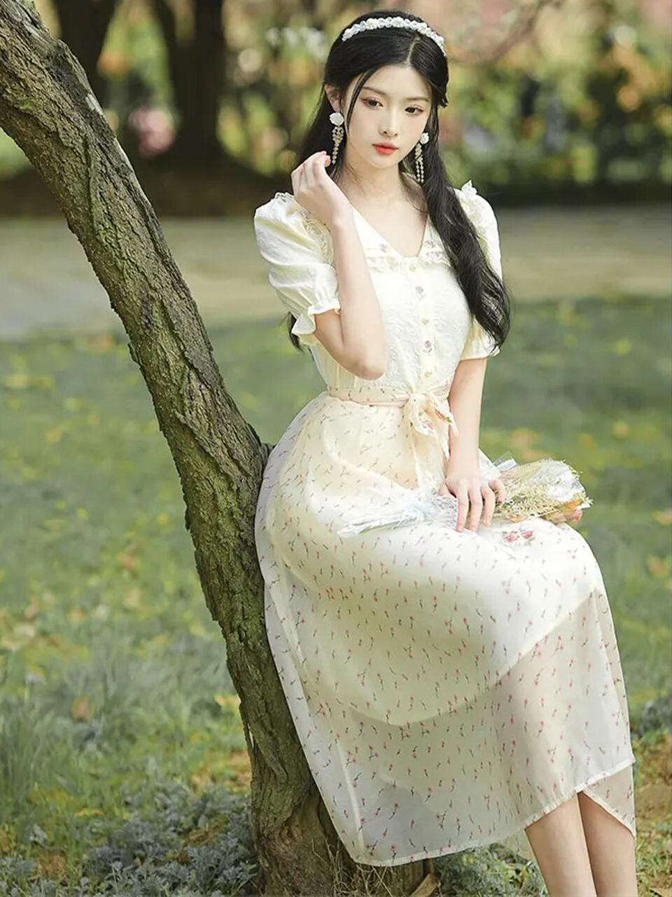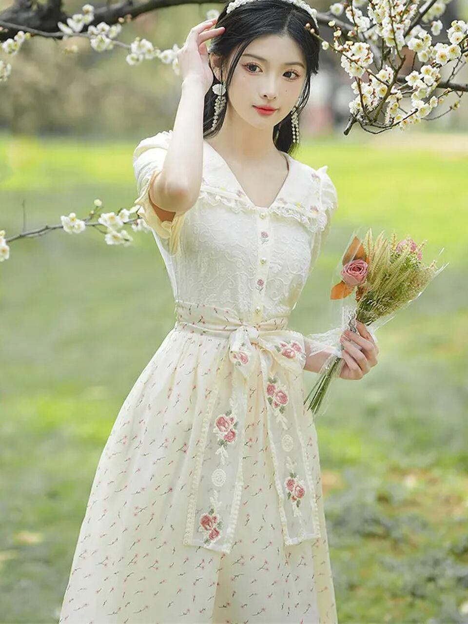 【0202】Lace Shirt Floral Skirt Short Sleeve 2 Piece Set
