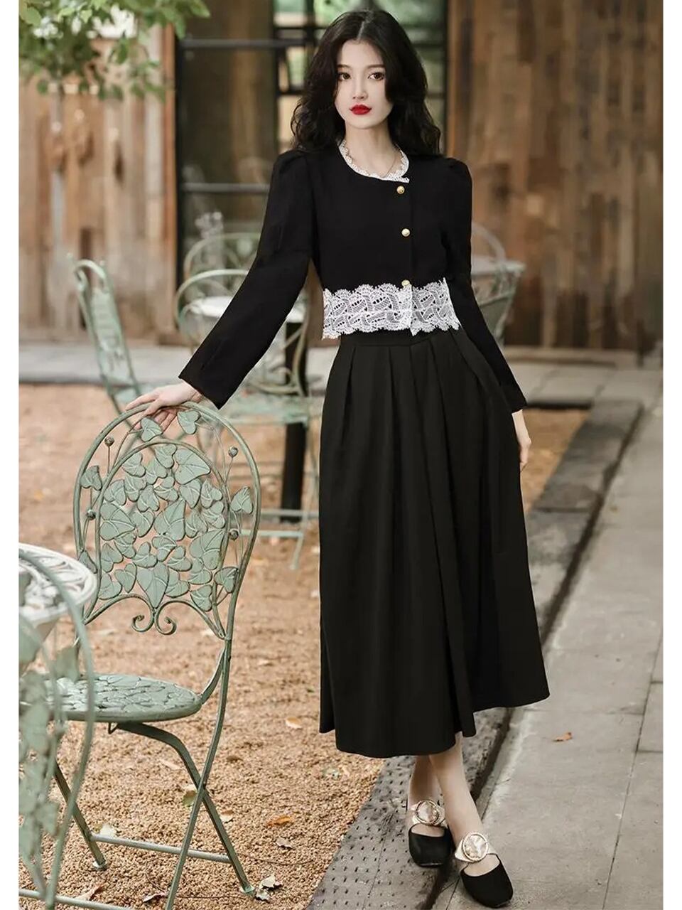 【0212】Pleated Skirt Cropped Shirt Long Sleeve 2 Piece Set