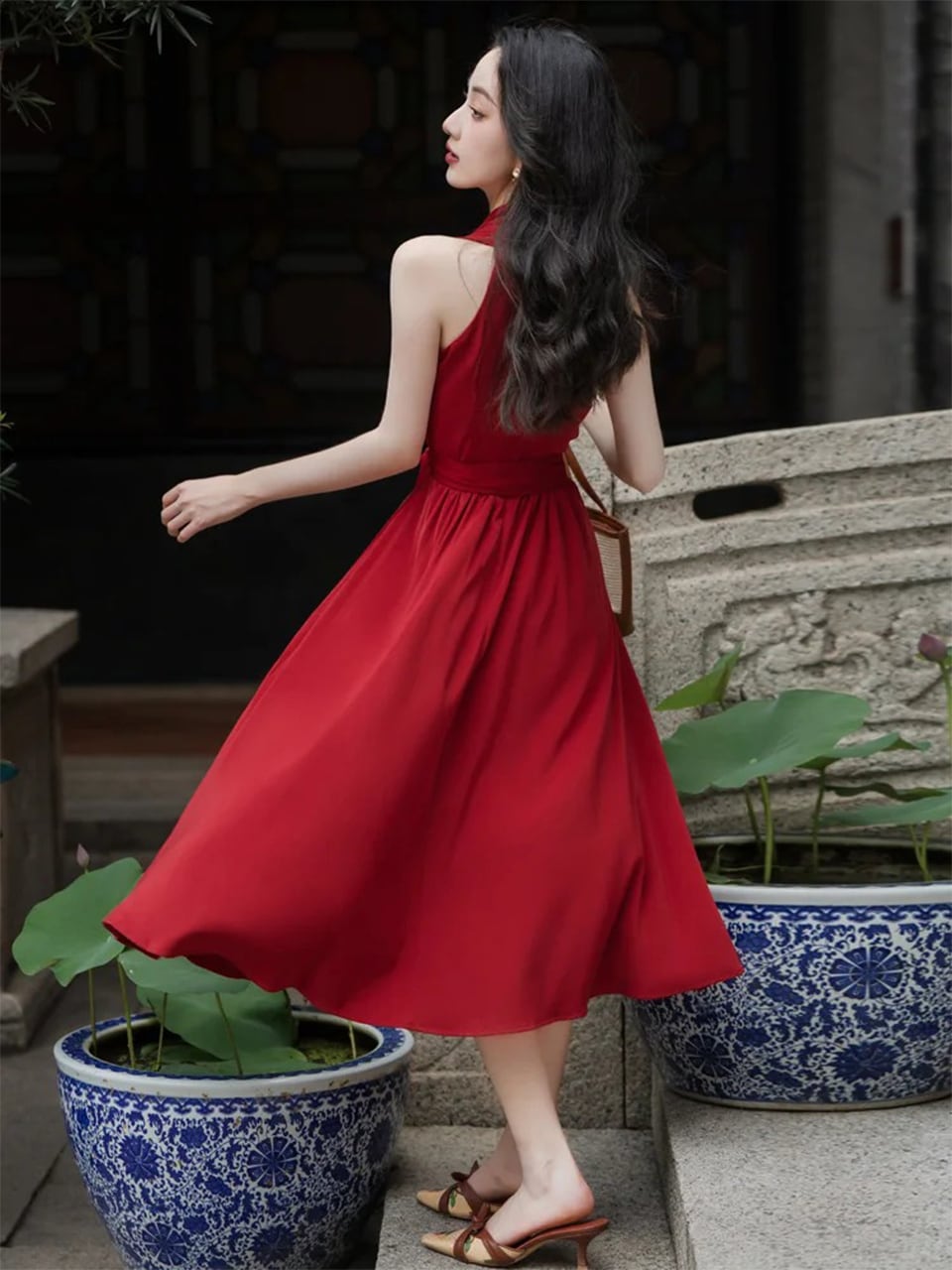 【0242】Red Chiffon Halter Neck Short Sleeve Dress